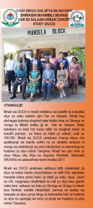 The Dar es Salaam Urban Cohort Study (DUCS), initiated in 2011, is a pioneering Demographic Surveillance System (DSS) designed to monitor health and socio-demographic events in Dar es Salaam, Tanzania. Established through a partnership between the Havard T.H Chan School of Public Health and Muhimbili University of Health and Allied Sciences (MUHAS), DUCS covers approximately 100,000 residents across 20,000 households in the Ukonga and Gongo la Mboto wards of Ilala district.
